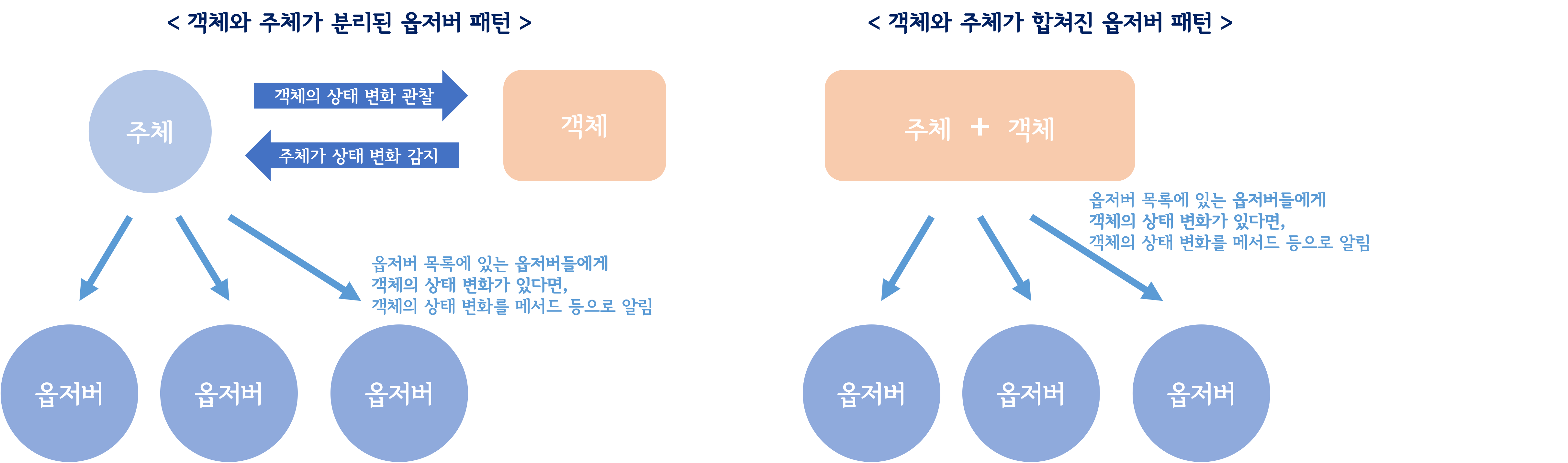 - 객체와 주체가 분리되어 있는 옵저버 패턴도 있고 객체와 주체가 합쳐진 옵져버 패턴도 있음.